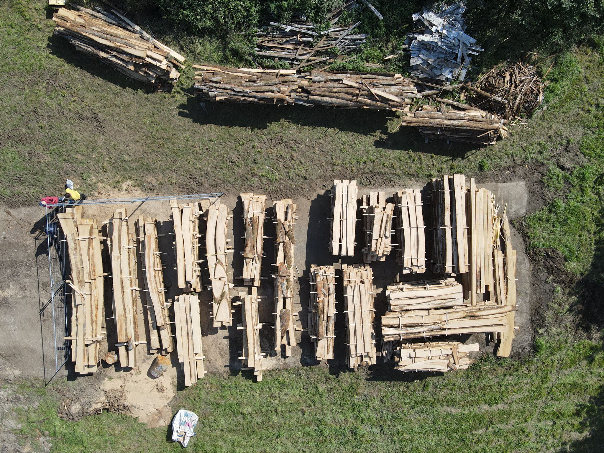 Désormais, nous allons laisser la nature faire son œuvre : le bois va sécher et se délester de son tanin. D’ici au moins 12 mois, nous pourrons le retravailler et lui offrir de nouvelles et belles fonctions.